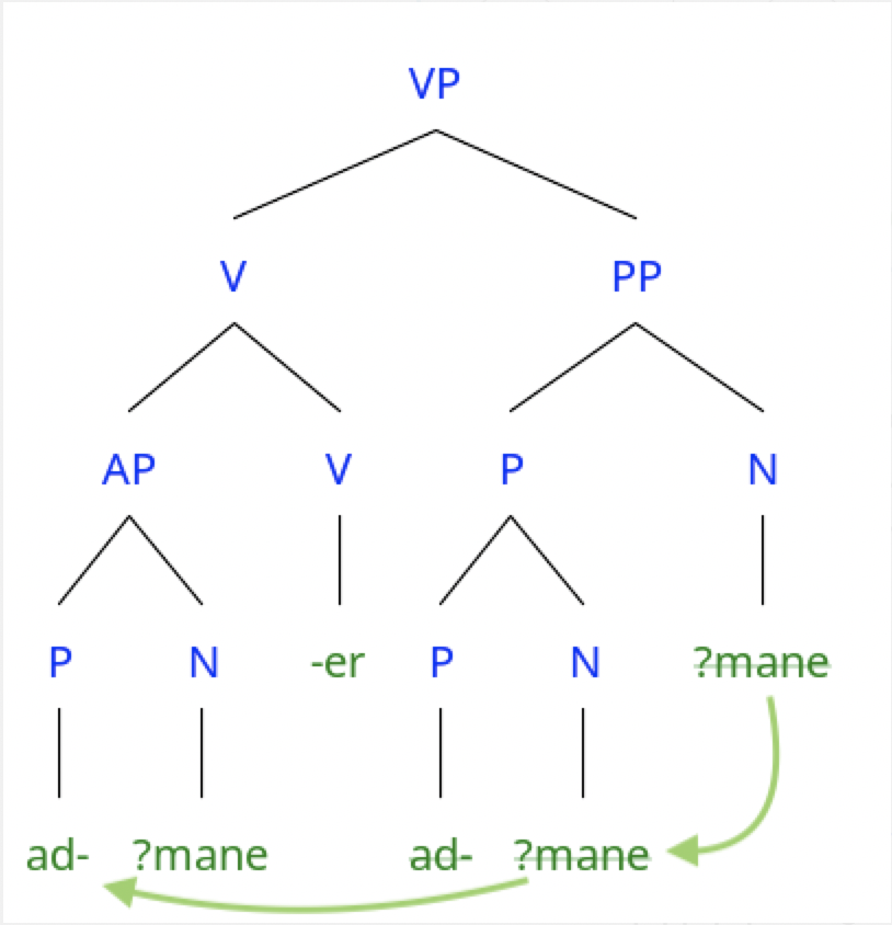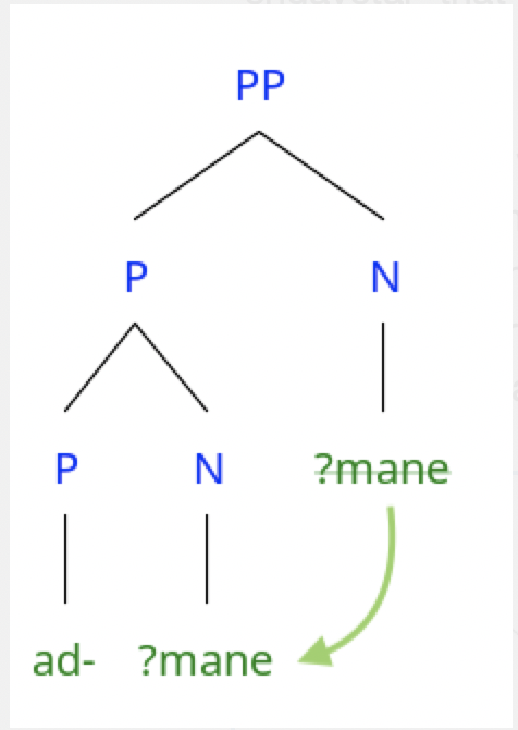 Imagine that we start with an abstract nominal root related to all things morning, we can call that √mane. We know that ad- is an affix coming from Latin with a prepositional meaning encoding direction, tendency, proximity, and contact among other relational properties. The root then moves to the abstract prepositional head. We end up with something like this